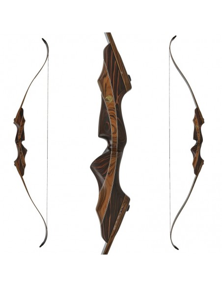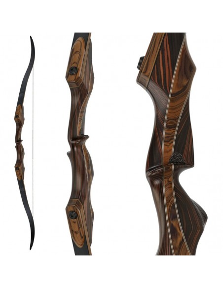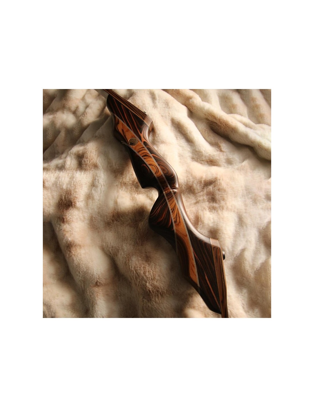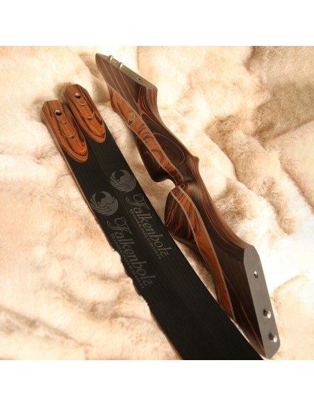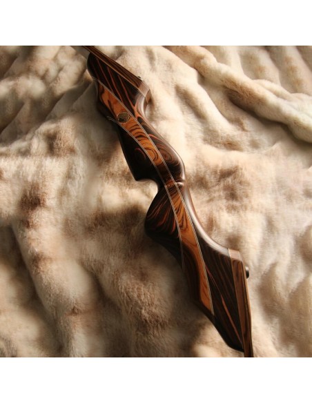 The Falkenholz ESSENCE - A bow that embodies the essence of Falkenholz: successful geometries, fine woods and powerful limbs. A perfect finish in timeless brown tones and with beautiful details: filigree trim lines, a checkering in the grip area and decorations on the limbs. The Essence focuses on timeless design and a medium bow weight. The middle section consists of 3 beautifully curved elements made of SRF rosewood in the middle and Ebano flower on the outer sides, visually separated from each other by decorative lines. Due to this special wood, the bow achieves a high torsional stiffness despite its moderate weight. The grip itself has the well-known and proven ergonomic shape FALKENHOLZ Peregrine and is additionally equipped with the proven thumb rest and a checkering.