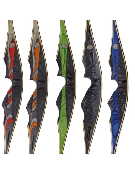 With a length of 66 or 68 inches, the Volcano is a modern, one-piece longbow which, with its filigree limbs, manages to find the perfect balance between optimum performance and maximum shooting smoothness. Its grip area consists of slightly curved elements made of grey actionwood, which are separated by a middle strip of coloured teknowood. The middle layer of wood is framed by two 2mm thick Micarta inlays, which increase the weight and provide optimal stiffening of the riser. All to increase comfort and bring the necessary stiffness to the grip area.