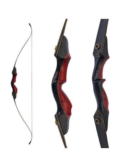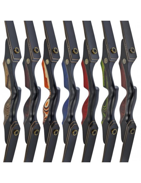 The DRAKE ARCHERY ELITE Chameleon is a 3-piece recurve bow with a strikingly elegant riser and simple, black limbs made of bamboo. The elegance of the riser is mainly due to the silk-matt black of the Deep Black Stabilizer Wood, which forms the outer part of the riser. The middle section is complemented by an inner section made of Dymondwood, which comes in a variety of mostly subtle colours.