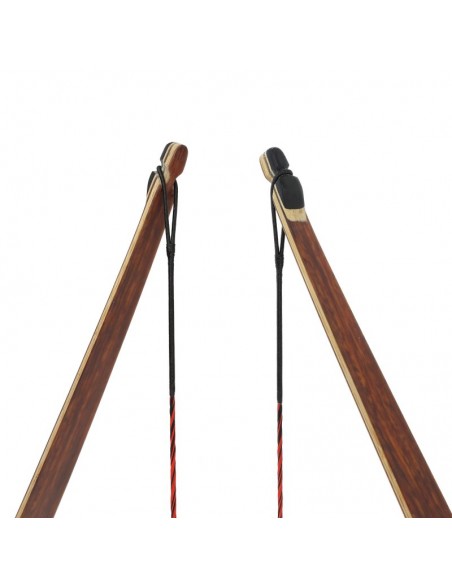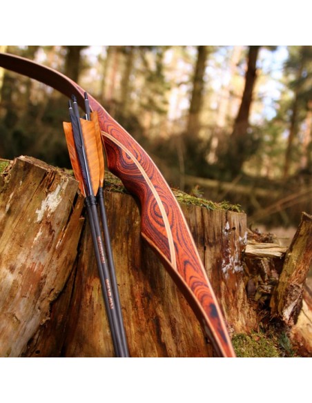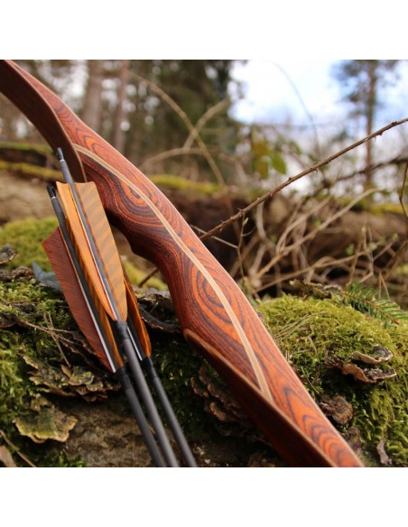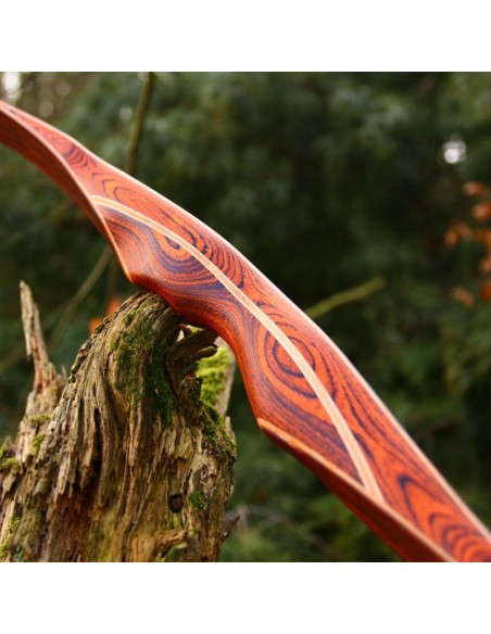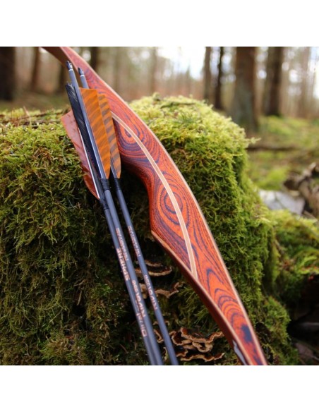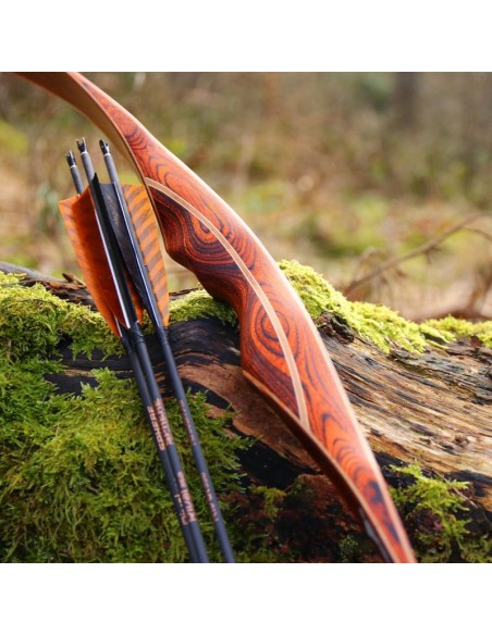 In addition to its fascinating appearance, the DRAKE ARCHERY ELITE Ablaze also impresses with the finesse of its bow class. No wonder, as a hybrid bow it combines the best of two worlds: At first glance it looks like a longbow, but at 62 inches it is clearly too short to be a "real" longbow. However, it makes up for the lack of size with the typical characteristic of a recurve bow, the clearly visible reflex-deflex shape in the limbs, and thus cleverly combines the characteristics of a longbow with those of a recurve bow. The result is a compact bow with a smooth draw, high arrow speeds and an almost complete reduction of vibrations in the grip. As is usual with a traditional longbow, the string of the hybrid bow does not touch the limbs, but only the tips.