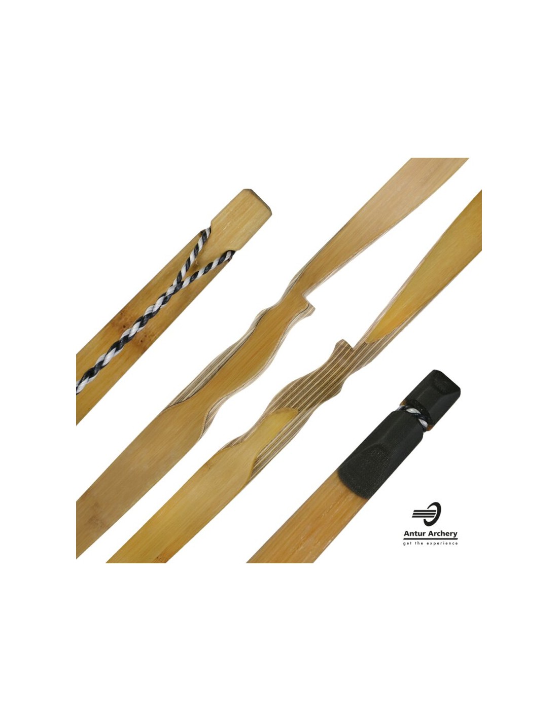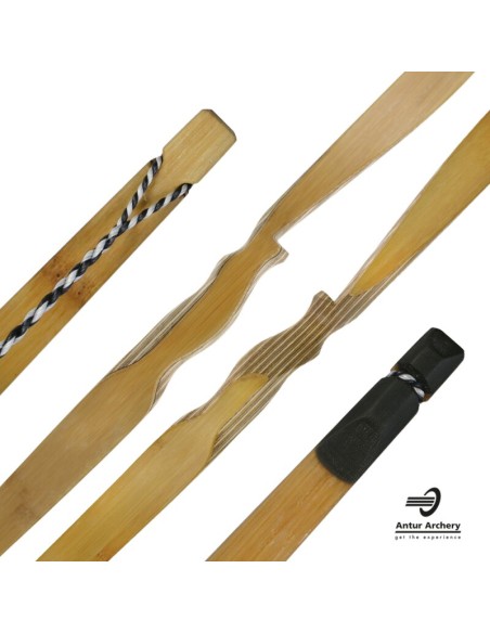- Material (limbs): CNC taped bamboo laminates (core), black glass, carbon.