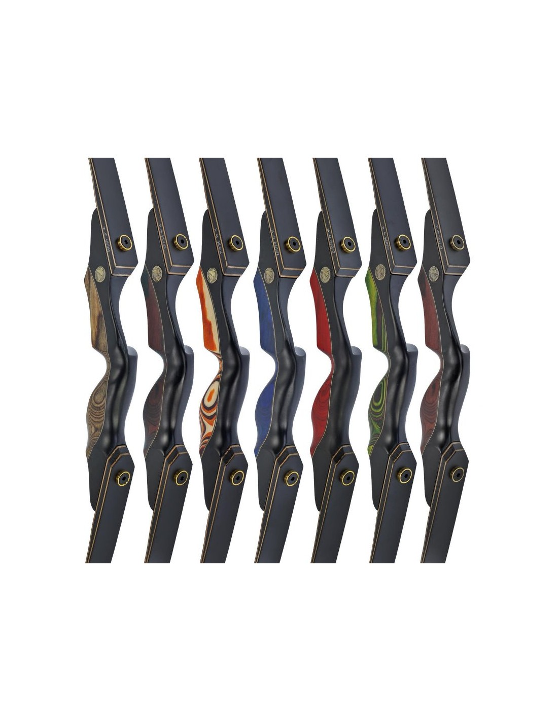 Il DRAKE ARCHERY ELITE Chameleon è un arco ricurvo in 3 pezzi con un riser straordinariamente elegante e flettenti semplici e neri in bambù. L'eleganza del riser è dovuta principalmente al nero seta opaco del legno di stabilizzazione Deep Black, che costituisce la parte esterna del riser. La sezione centrale è completata da una sezione interna in Dymondwood, disponibile in una varietà di colori per lo più tenui.