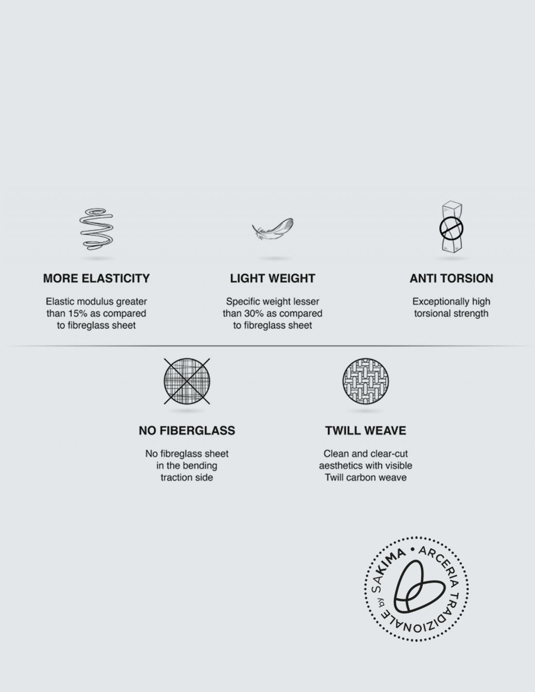 Le lamine in Carbonio preimpregnato sono il risultato di una ricerca che SAKIMA ha avviato nel 2016 con proprie sperimentazioni e successivamente collaborando con uno studio di Engineering specializzato nello sviluppo di materiali compositi con particolare competenza nel trattamento di prodotti finiti in carbonio. L’obiettivo che ci siamo prefissati di raggiungere è quello di riuscire a produrre una lamina con stratificazione in diversi tipi di carbonio dedicata esclusivamente al mercato della laminazione di flettenti per arcieria. Gli ingegneri ed i tecnici che ci hanno supportato nello sviluppo del prodotto hanno individuato una stratificazione composta da vari e diversi tipi di tessuto di carbonio; ogni tessuto con caratteristiche diverse e con una specifica funzione che, in abbinamento agli altri, da come risultato una lamina prepreg pronta all’uso ed all’incollaggio in stratificazione per flettenti ad alte prestazioni. Le varie sperimentazioni che abbiamo avviato sul prodotto lamina hanno certificato un utilizzo della stessa in abbinamento con le forze in trazione del flettente. La resistenza torsionale del flettente sottoposto a laminazione con TRACTION CARBON, è eccezionalmente alta. Il peso specifico di TRACTION CARBON è inferiore del 30% rispetto alla lamina in fibra di vetro. Nonostante il minore peso però il modulo elastico è superiore del 15% rispetto alla fiberglass. Questo determina una minore inerzia del flettente in fase di chiusura al rilascio con conseguente aumento prestazionale dello stesso.