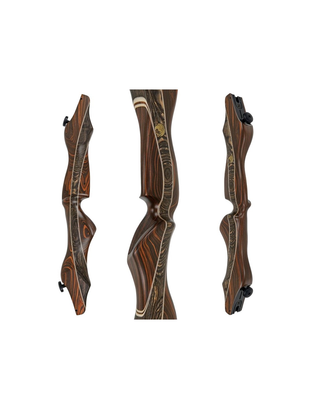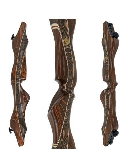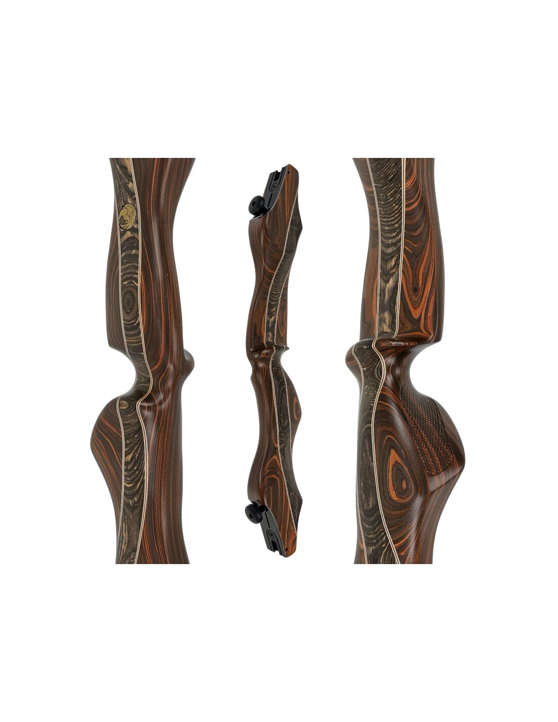 Falkenholz ESSENCE - Un riser che incarna l'essenza di Falkenholz: geometrie di successo, legni pregiati e attacchi universali per i flettenti. Una finitura perfetta nelle intramontabili tonalità del marrone e con splendidi dettagli: linee decorative in filigrana, zigrinatura nell'area dell'impugnatura. L'Essence punta su un design senza tempo e su un peso medio dell'arco. Il riser è composto da 3 elementi splendidamente curvi, visivamente separati l'uno dall'altro da linee decorative, con palissandro SRF al centro e fiore di ebano sui lati esterni. Questo legno speciale conferisce al riser un elevato grado di rigidità torsionale nonostante il peso moderato. L'impugnatura ha la ben nota e collaudata forma ergonomica del FALKENHOLZ Peregrine ed è inoltre dotata del collaudato appoggio per il pollice e della zigrinatura.