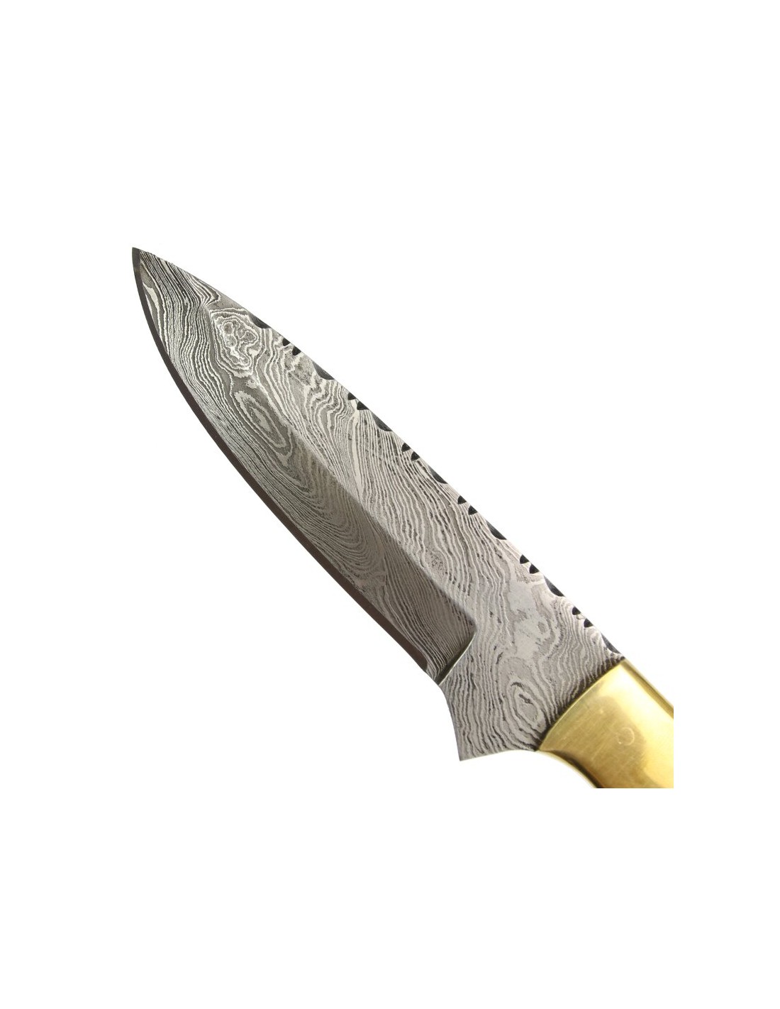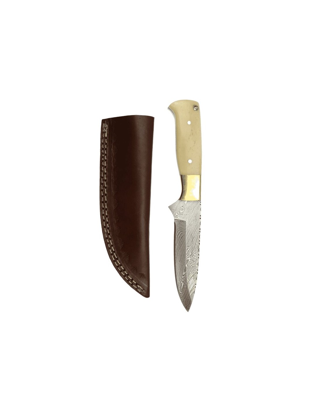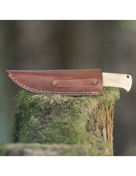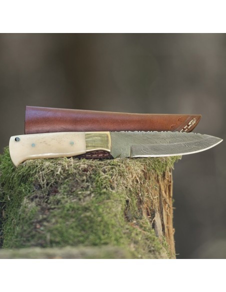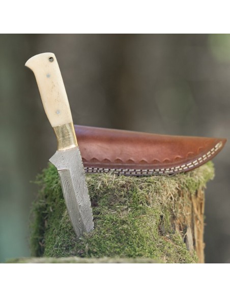 elTORO Brass Bone - Damasco - Coltello da caccia - 12 cm - fodero in pelle incluso